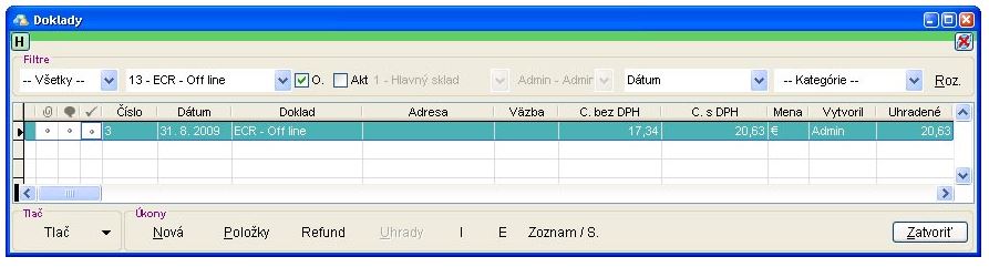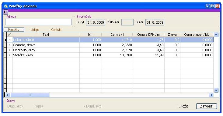 2. Po kliknutí na tento doklad (tým sa označí) a následnom kliknutí na úkon Položky sa zobrazí okno Položky dokladu. Tu je možné vidieť predané položky z dennej uzávierky.