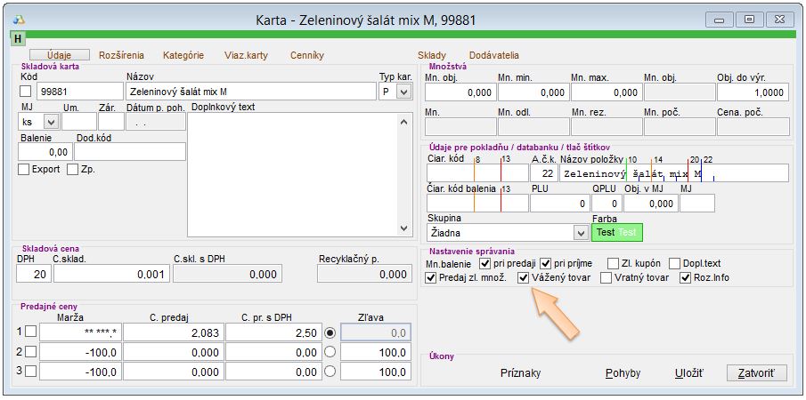 - Vytvoriť skladové karty pre jednotlové druhy šalátov. (Každá skladová karta môže mať nastavenú len jednu hmotnosť obalu, ktorý sa bude od celkovej váhy odpočítavať. Ak sa používajú misky rôznych hmotností a veľkostí, je potrebné založiť viacero skladových kariet. Ak sú predávané šaláty v rovnakej cene, ale zákazník má na výber misku do ktorej si naberá, je možné založiť napr. 3 skladové karty - Šalát S, Šalát M, Šalát L.)