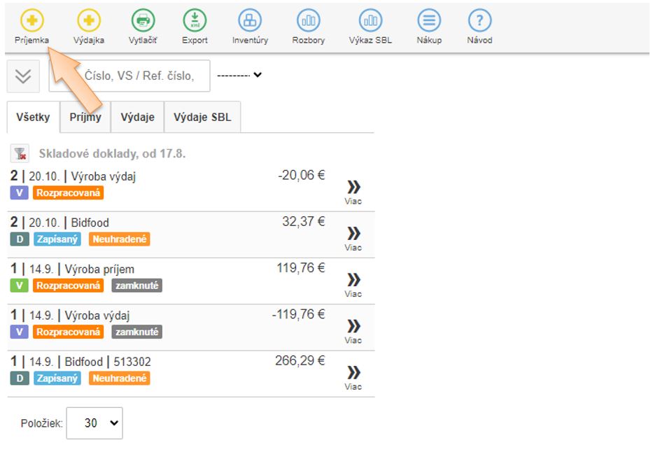 2. Kliknutím na + Príjem vytvoríte skladový výdaj.