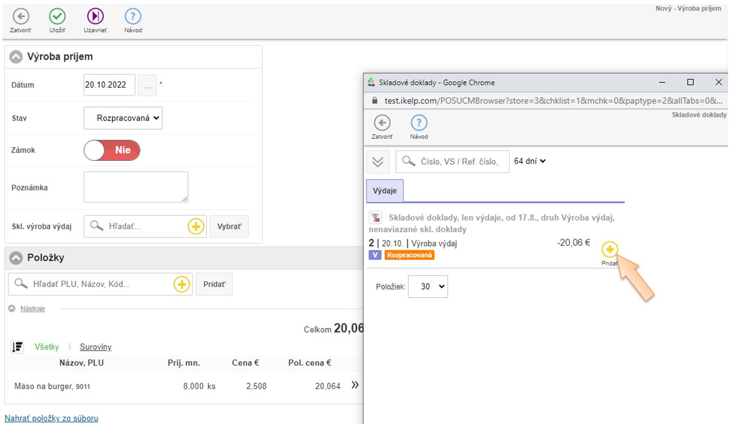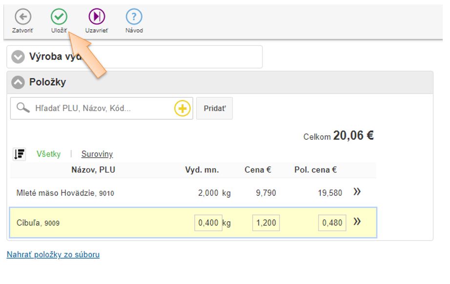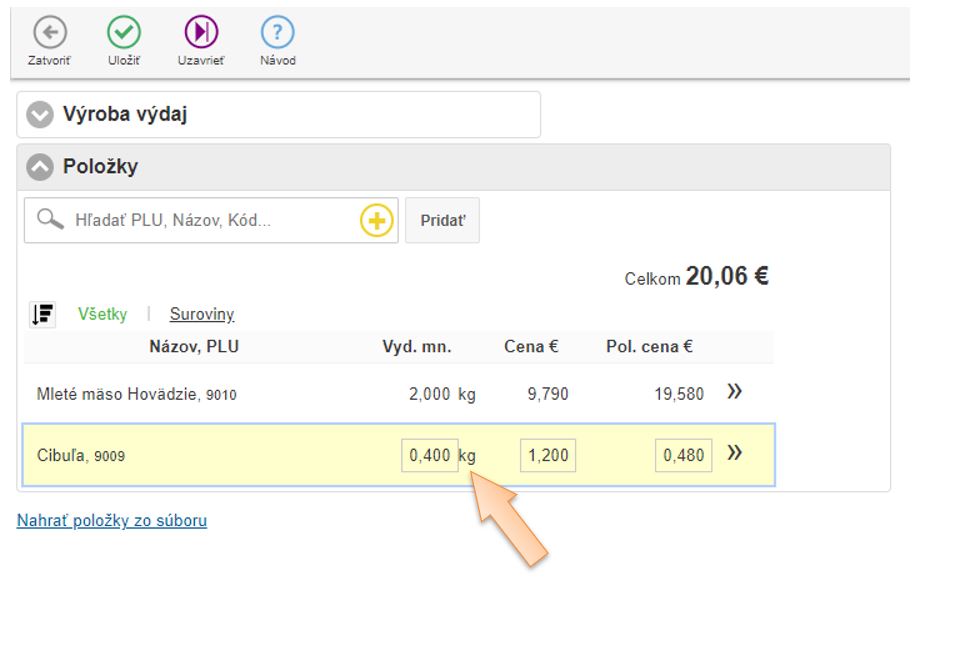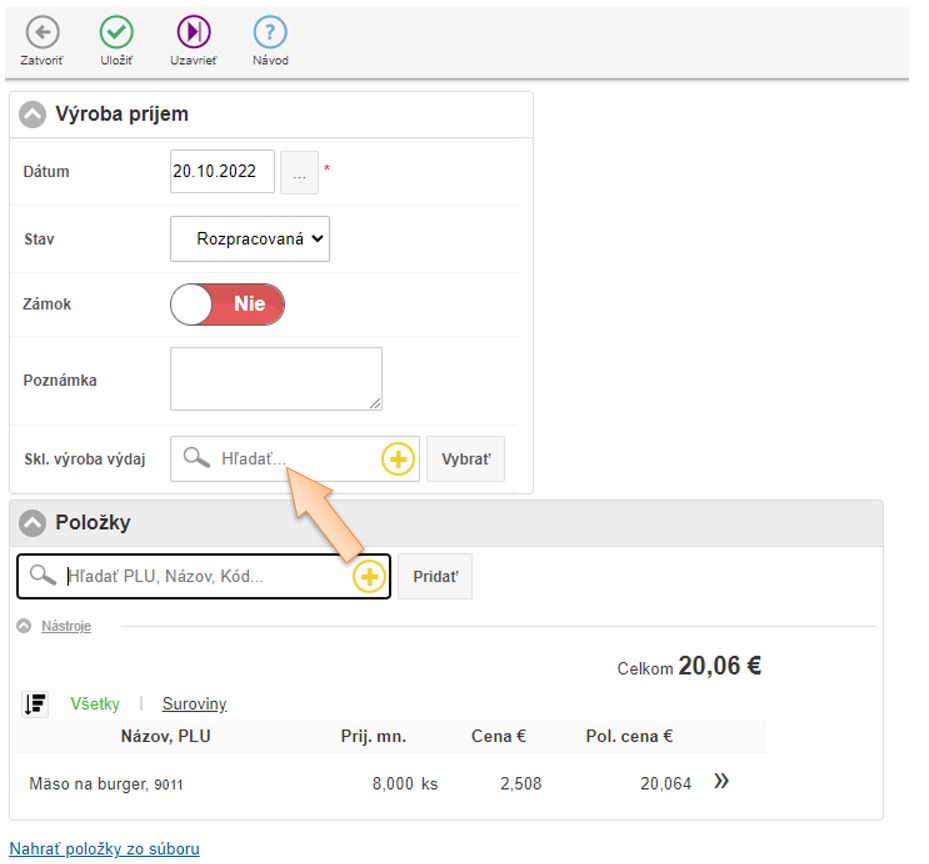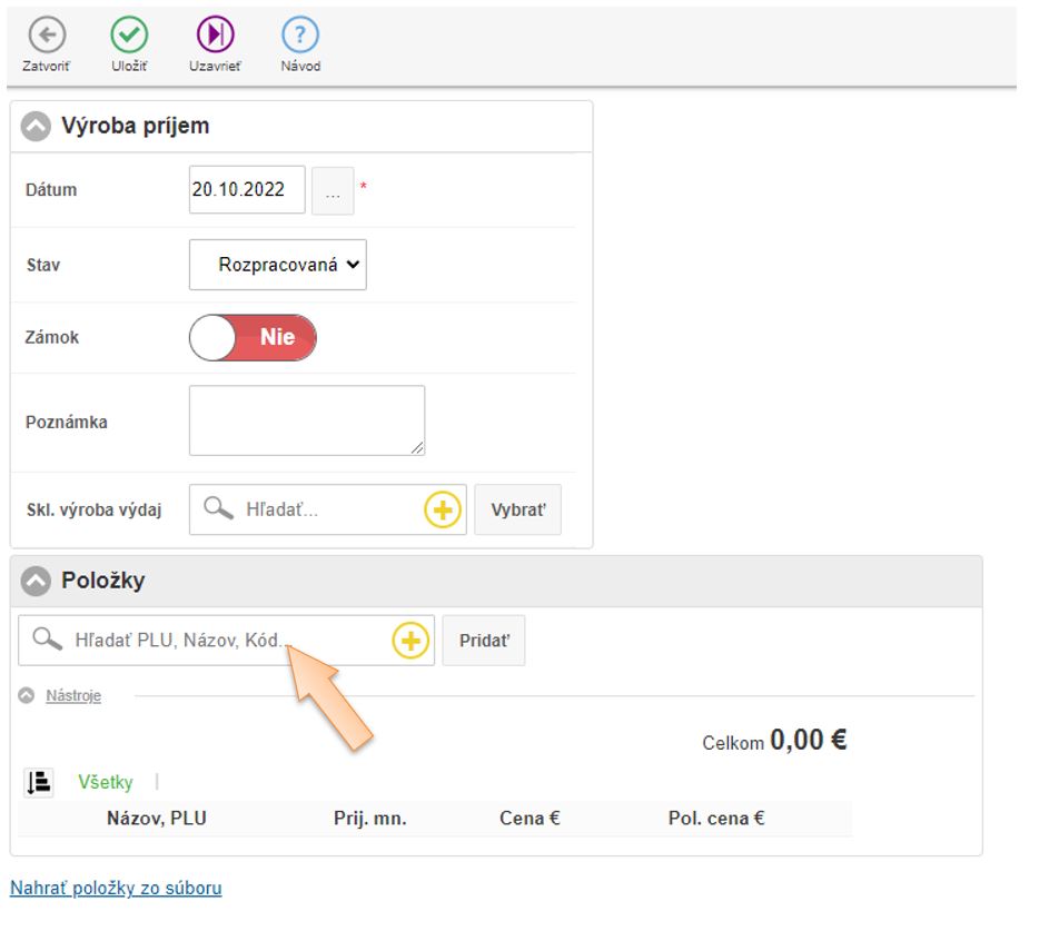 4. Vložte položky do dokladu ktoré vznikajú výrobou, zadajte množstvo a skladovú cenu.