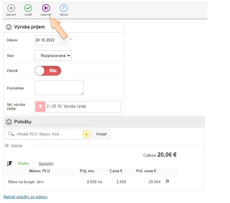 • Doklad môžete Uložiť, alebo Uzavrieť, pri uzavretí sa mení systémový stav doklad a doklad sa automaticky uzamyká proti úprave.