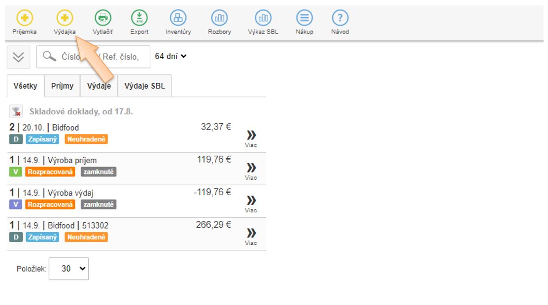 2. Kliknutím na + Výdajka vytvoríte skladový výdaj.