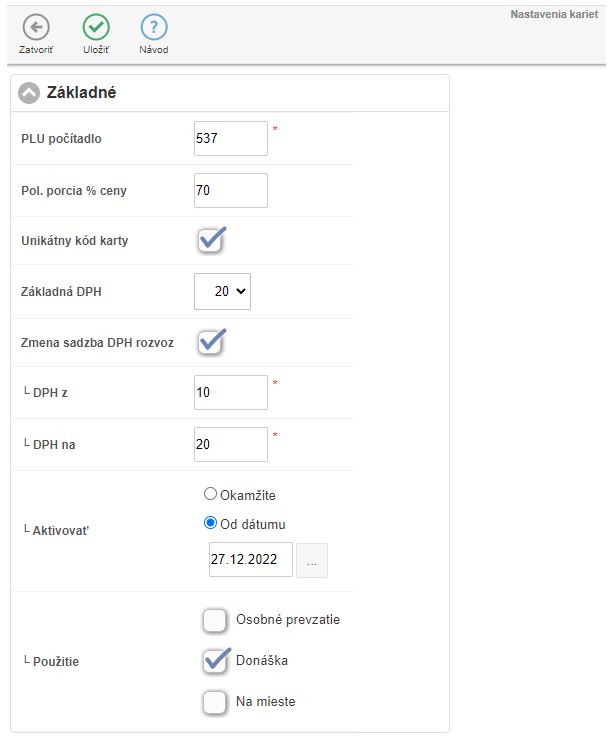 • Základná DPH - Základná výška DPH pre novo vytvárané karty.