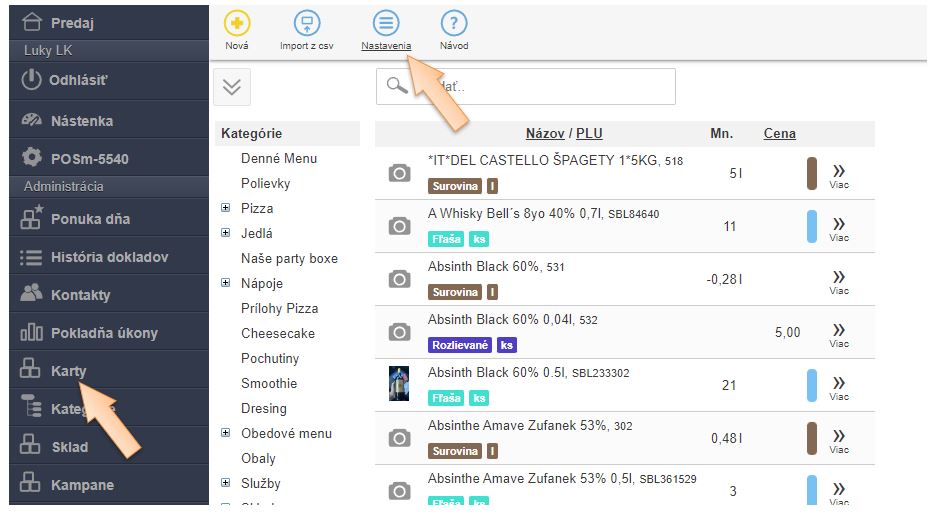 V tomto návode vám predstavíme nastavenia skladových kariet v aplikácii iKelp POS Mobile. Pre zobrazenie nastavení skladových kariet kliknite na tlačidlo Karty v menu aplikácie a pokračujte kliknutím na Nastavenia na nástrojovej lište.