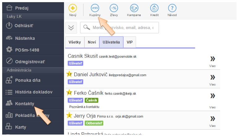 - Zľavové kupóny je možné upravovať v Menu aplikácie, v časti Kontakty, kliknutím na tlačidlo Kupóny na navigačnej lište aplikácie.
