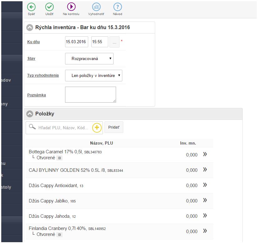 Rýchla inventúra - položky inventúry
